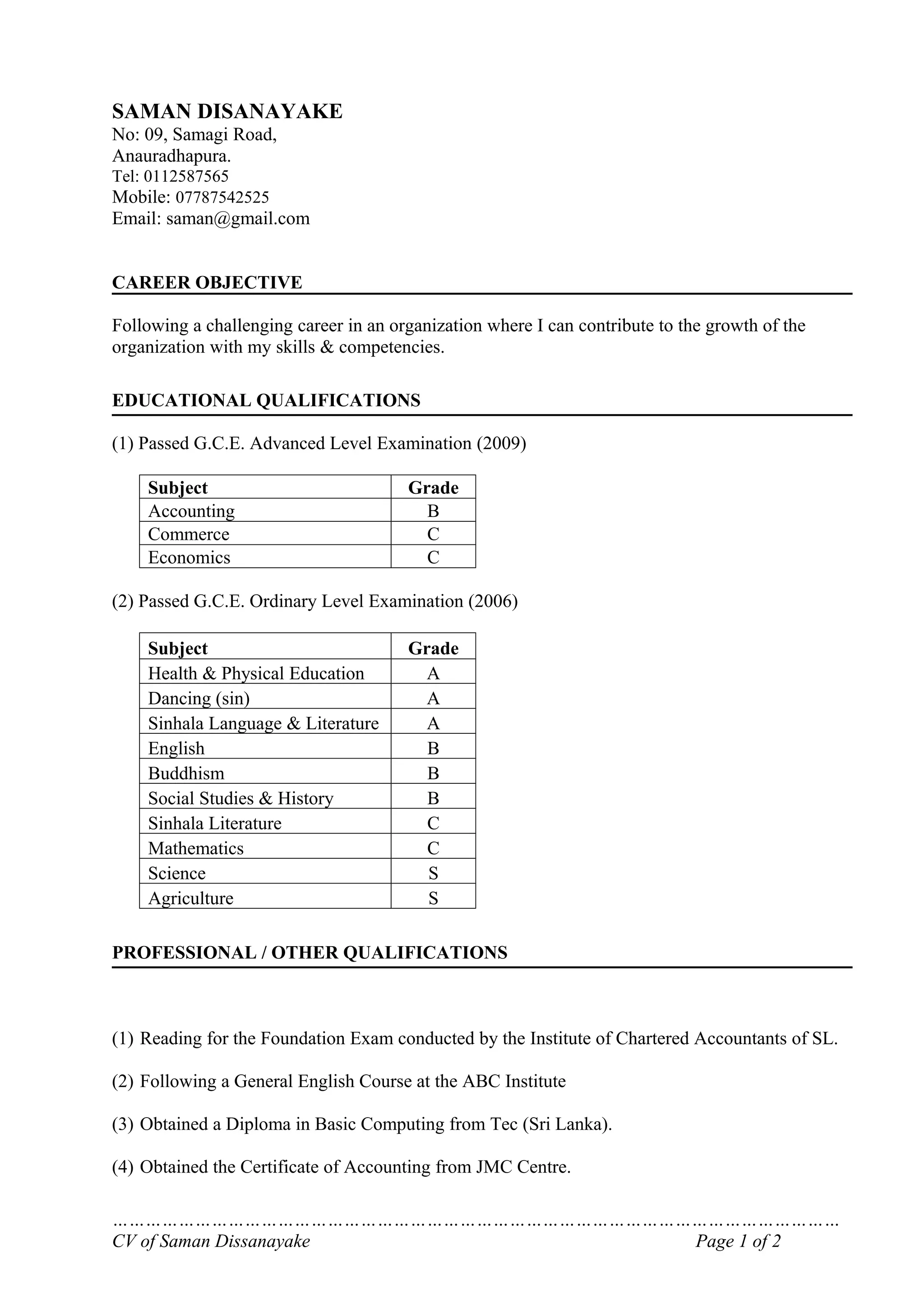 This document is a 2-page CV for Saman Dissanayake providing personal details, educational qualifications, professional qualifications, extracurricular activities, career objective, and references. Saman obtained A Levels in 2009 with grades of B in Accounting, C in Commerce and Economics. He received A's in several subjects and B's at his O Level exam in 2006. His professional qualifications include studying for the CA Sri Lanka Foundation exam and obtaining a diploma in basic computing. He played basketball for his school team and was a senior prefect and president of the commerce society.
