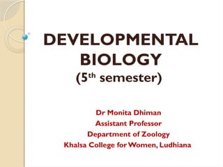 This document outlines a syllabus for a developmental biology course, covering historical perspectives, fundamental processes of embryogenesis, and stages of development in animals. It includes units on gametogenesis, fertilization, cleavage, cell interactions, and the formation of fetal membranes. The course emphasizes key concepts such as induction, differentiation, and metamorphosis in various species.