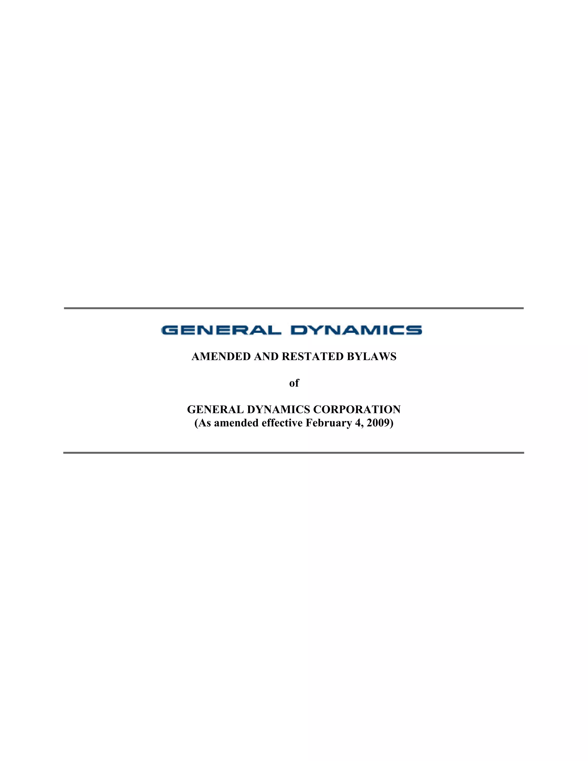 This document outlines the amended and restated bylaws of General Dynamics Corporation as of February 4, 2009. It addresses topics such as the location of registered offices, procedures for stockholder meetings, requirements for the board of directors, responsibilities of corporate officers, and procedures for capital stock transactions. The bylaws establish rules for notice, quorum, voting, and other governance matters to guide the operations of the corporation according to Delaware law.