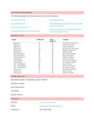 This document summarizes general English classes including course levels, materials, teacher qualifications, pricing and additional resources. General English classes are adapted to students' needs and can take place individually or in groups. Classes are taught by a CELTA-certified teacher and include a diagnostic test, monthly progress reports, optional exams and certificates. Course prices range from $16,500-$25,000 CLP per hour depending on individual or group format.