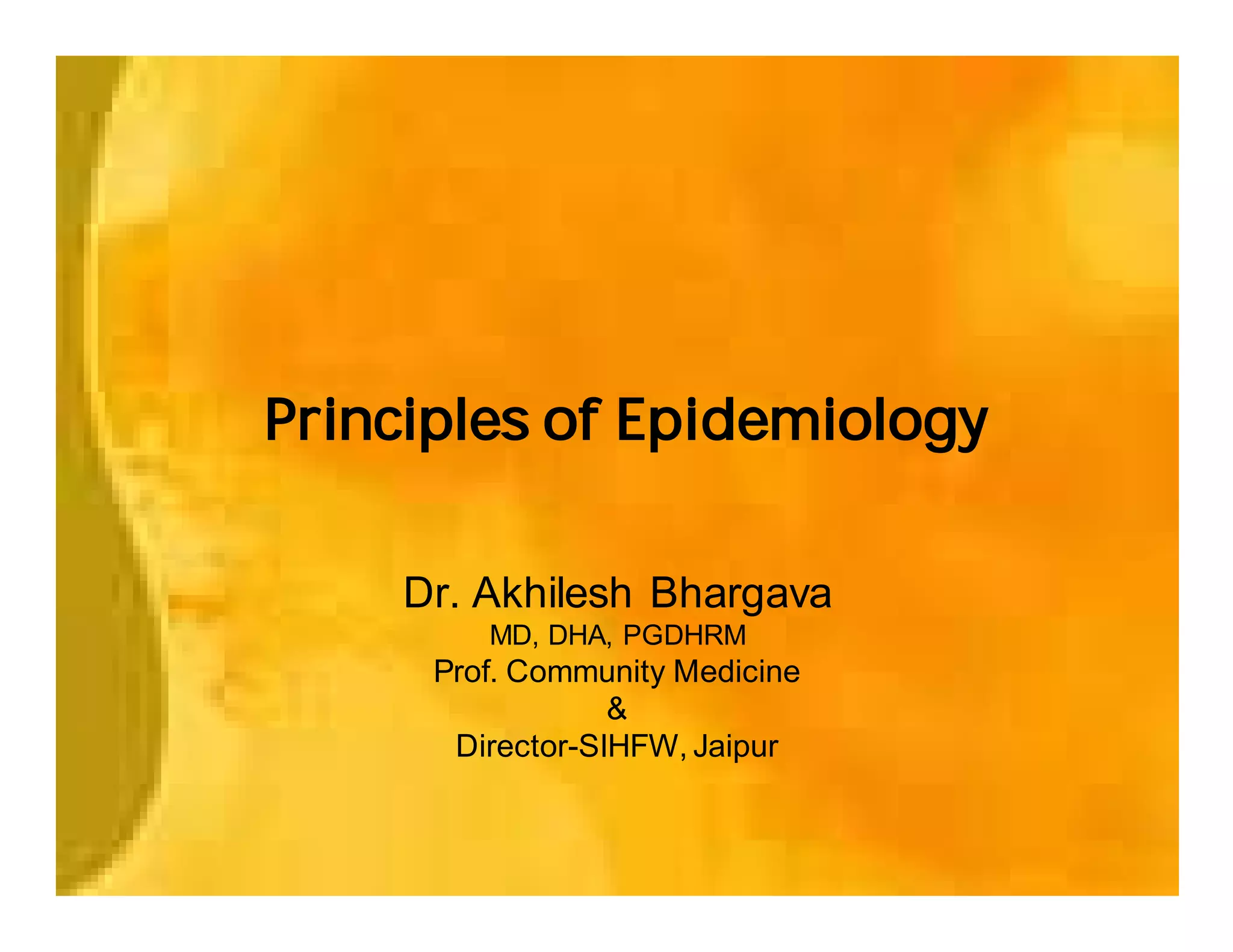 This document provides an overview of epidemiology and public health planning principles. It defines epidemiology as the study of distribution and determinants of health problems in populations and its application to control such problems. The key objectives of epidemiology are described as understanding disease causation, testing hypotheses, evaluating intervention programs, and informing public health administration. Effective public health planning requires defining goals, objectives, strategies, approaches, and approaches for monitoring and evaluation. Descriptive epidemiology involves observing the basic features of disease distribution by person, place, and time to identify problems and plan services. Developing hypotheses about potential causes involves interrogating usual suspects and looking for clues in patterns of who, where, and when individuals become ill.