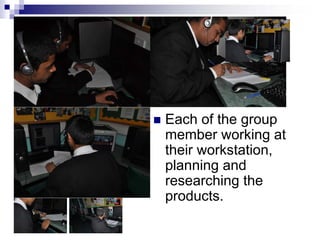 This PowerPoint contains evidence of the group collaborating in the construction and planning stages prior to the production stage, with each member working at their workstation to plan and research products and some initial work being produced, along with a timetable to organize and maximize their work.