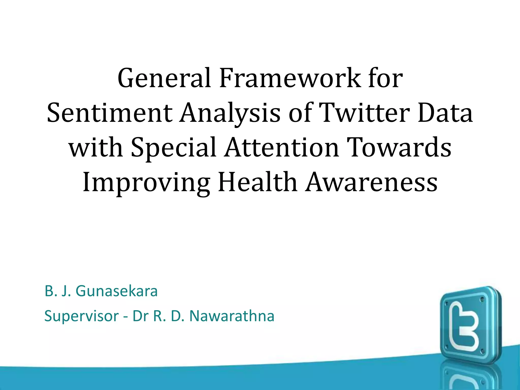 This document presents a framework for sentiment analysis of Twitter data aimed at improving health awareness by analyzing public reactions to common illnesses and treatments. Utilizing natural language processing techniques, it employs a Naïve Bayes classifier on pos-tagged bigrams to classify sentiments in tweets. The research includes various datasets related to health issues and demonstrates that the approach enhances the extraction of meaningful insights from social media communications.
