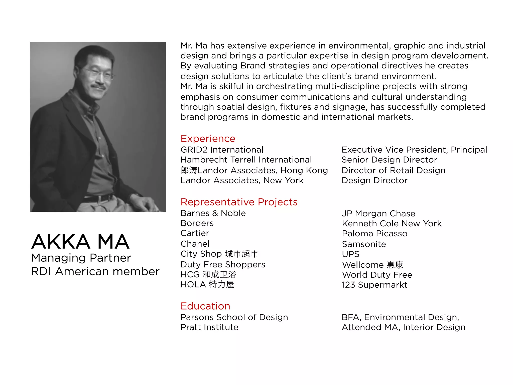 Mr. Ma has extensive experience in environmental, graphic and industrial design. He evaluates brand strategies and creates design solutions to articulate clients' brand environments. Mr. Ma is skilled in orchestrating multi-discipline projects with a focus on consumer communications and cultural understanding through spatial design, fixtures, and signage. He has successfully completed both domestic and international brand programs.