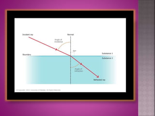 The document discusses the nature and laws of light refraction, including Snell's Law and various types of lenses. It explains the phenomenon of bending light as it passes between different media, covering topics such as refraction through glass slabs and prisms, as well as the role of refraction in human vision. Additional focus is given to spherical and cylindrical lenses, detailing their uses in correcting vision and the mechanics behind image formation in the eye.