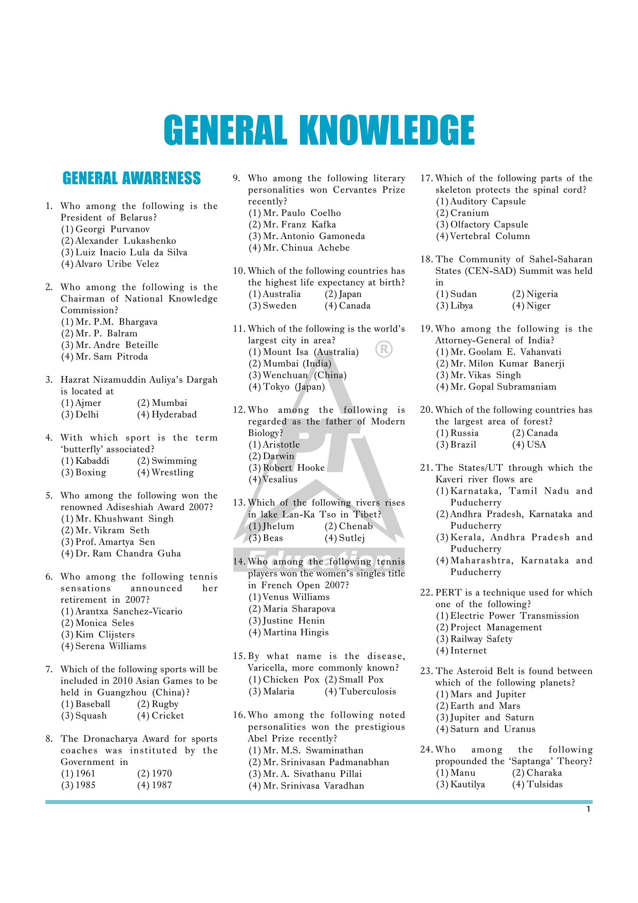This document contains a general knowledge quiz with 73 multiple choice questions covering topics like presidents and prime ministers, awards, geography, history, literature, science and technology, sports, and business. The questions are designed to test one's general awareness and knowledge across many domains.