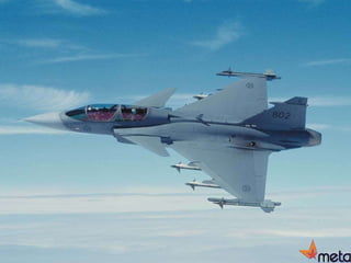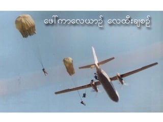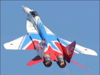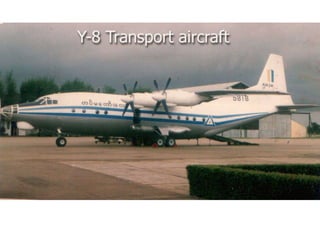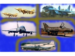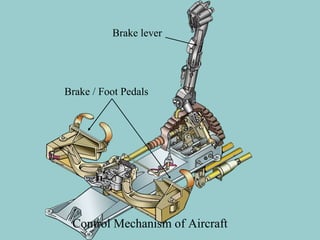 The document discusses various braking mechanisms used in aircraft, including multi-disc brakes, carbon brakes, thrust reversers, drag parachutes, air brakes, and tail hooks. It provides diagrams and photos showing the components and operation of aircraft brakes such as rotors, stators, brake units, and skid detectors.