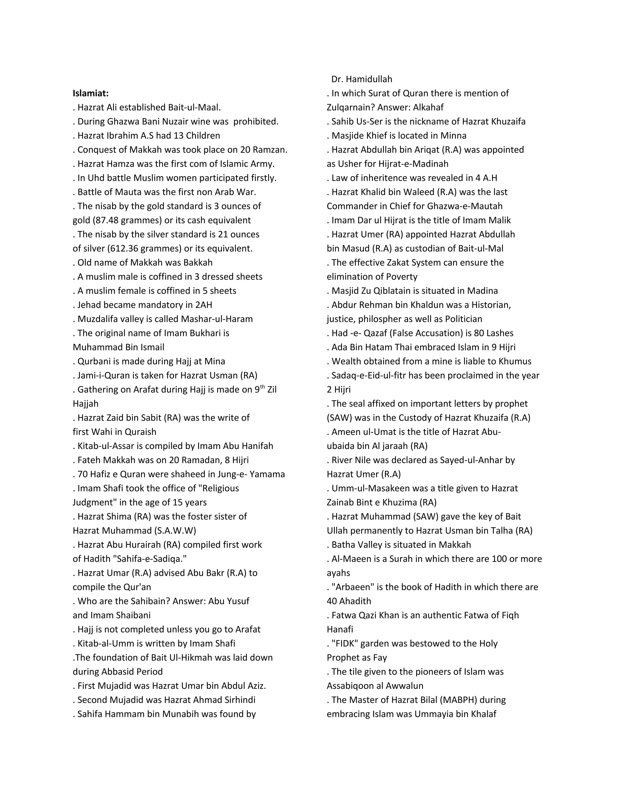 This document contains information about various topics in Islamiat and Pakistan Studies. Some key points include: