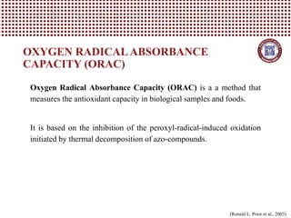 This document provides information on several common methods used to measure antioxidant capacity in biological samples and foods. It describes the principles, procedures, and key measurements of assays such as ORAC, DPPH, ABTS, Folin-Ciocalteu, FRAP, CAA, HPLC, UPLC, and ELISA. These assays utilize different chemical reactions and detection methods to quantify a sample's ability to inhibit oxidation initiated by free radicals.