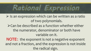 The document discusses rational expressions and functions. It defines rational expressions as ratios of polynomials where the numerator and/or denominator can contain variables. It provides examples of reducing rational expressions to lowest terms by factoring and canceling common factors. It also discusses rational equations and inequalities involving rational expressions.