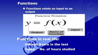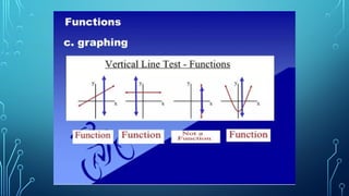 The document provides an overview of functions in mathematics, defining them as relations where each input corresponds to exactly one output. It includes examples of functions, activities for determining domain and range, and illustrates the vertical line test to verify if a relation is a function. Additionally, it presents specific exercises for evaluating functions and applying mathematical principles.