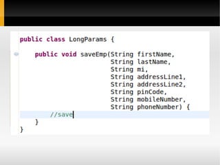 The document outlines best practices for Java method naming and design, emphasizing clarity, consistency, and minimal complexity. It suggests avoiding datatype names in method names, using interfaces over classes, and preferring exceptions over null returns. Lastly, it includes tips on comparing values and methods for better coding practices.