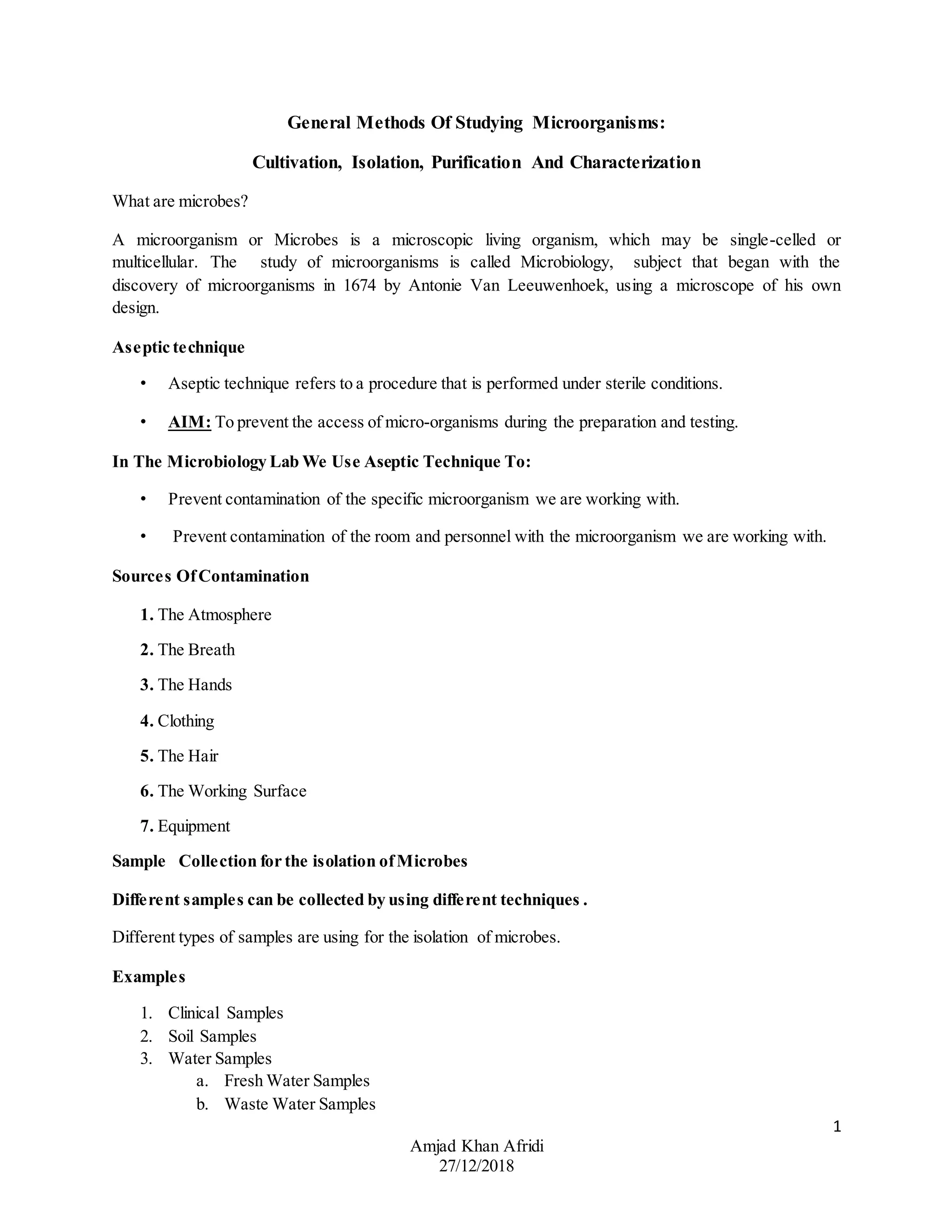 Microorganisms can be studied through cultivation, isolation, purification, and characterization techniques. Samples are collected from various sources and streaked onto agar plates using aseptic technique to prevent contamination. Single colonies are then purified by streaking and incubating to obtain a pure culture of a single microbial species. The isolated microbe can be characterized through morphological analysis under a microscope, biochemical testing of metabolic activities, and other identification methods. This allows scientists to determine the type of microorganism being studied.
