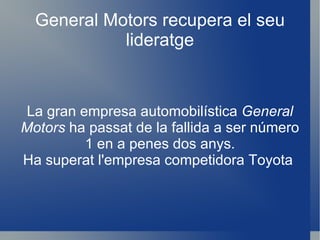 General Motors recuperael seu lideratge La gran empresa automobilística General Motors ha passat de la fallida a ser número 1 en a penes dos anys. Ha superat l'empresa competidora Toyota