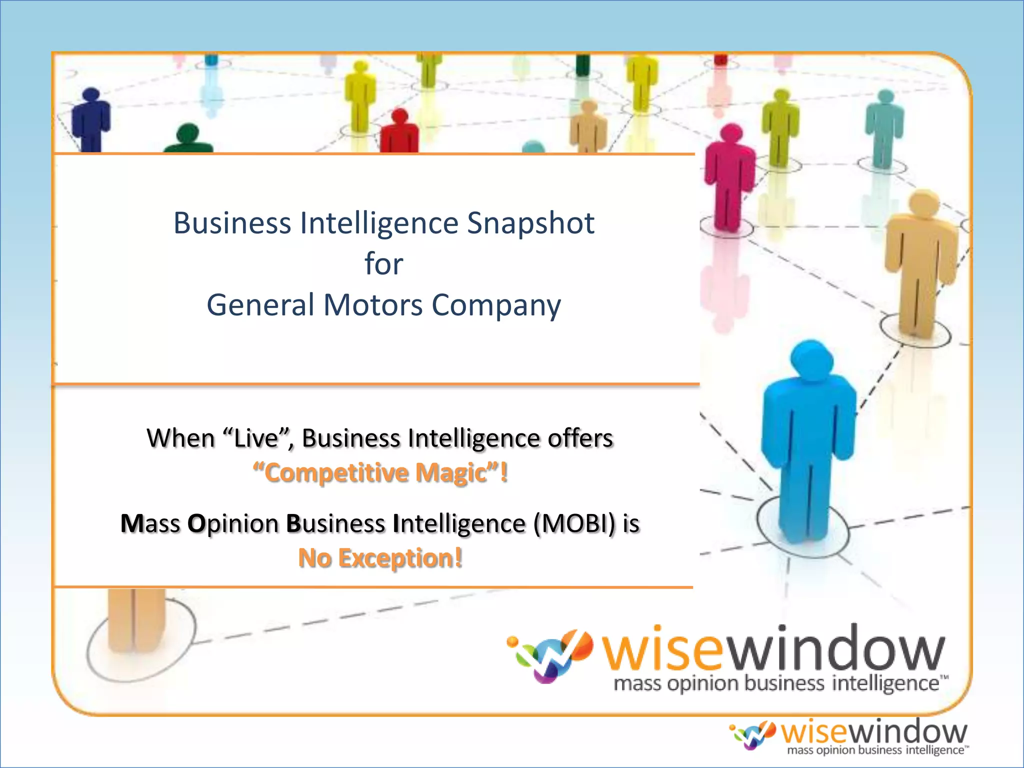 The document discusses a business intelligence snapshot for General Motors Company, emphasizing the importance of understanding competitive landscapes and customer sentiments to drive strategic decisions. It outlines various aspects such as market share, strengths and weaknesses, and consumer engagement channels, while highlighting the value added by Mass Opinion Business Intelligence (MOBI). The call to action invites participation in a limited-time initiative to explore these insights further.