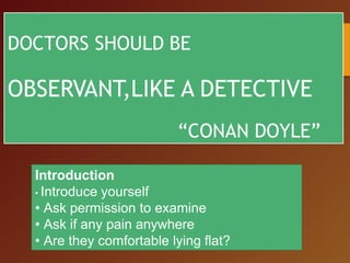 Doctors should carefully observe patients like detectives during physical examinations. The document outlines the process of a physical assessment including preparation, examination methods, and conducting assessments from head to toe. Key steps involve introducing oneself, obtaining permission before examining, asking about pain or discomfort, inspecting various body systems, and documenting findings and vital signs. Physical assessments provide objective health information through direct observation and examination techniques.