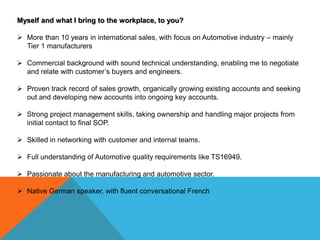 The document provides information about the author's qualifications and experience for a sales or account management role. It outlines over 10 years of experience in international automotive sales, with a commercial background and technical understanding. It also emphasizes relationship building and customer focus skills, as well as experience managing projects, meeting quality standards, and networking within companies. The author believes their attitude and customer-centric approach will help them exceed expectations if hired.