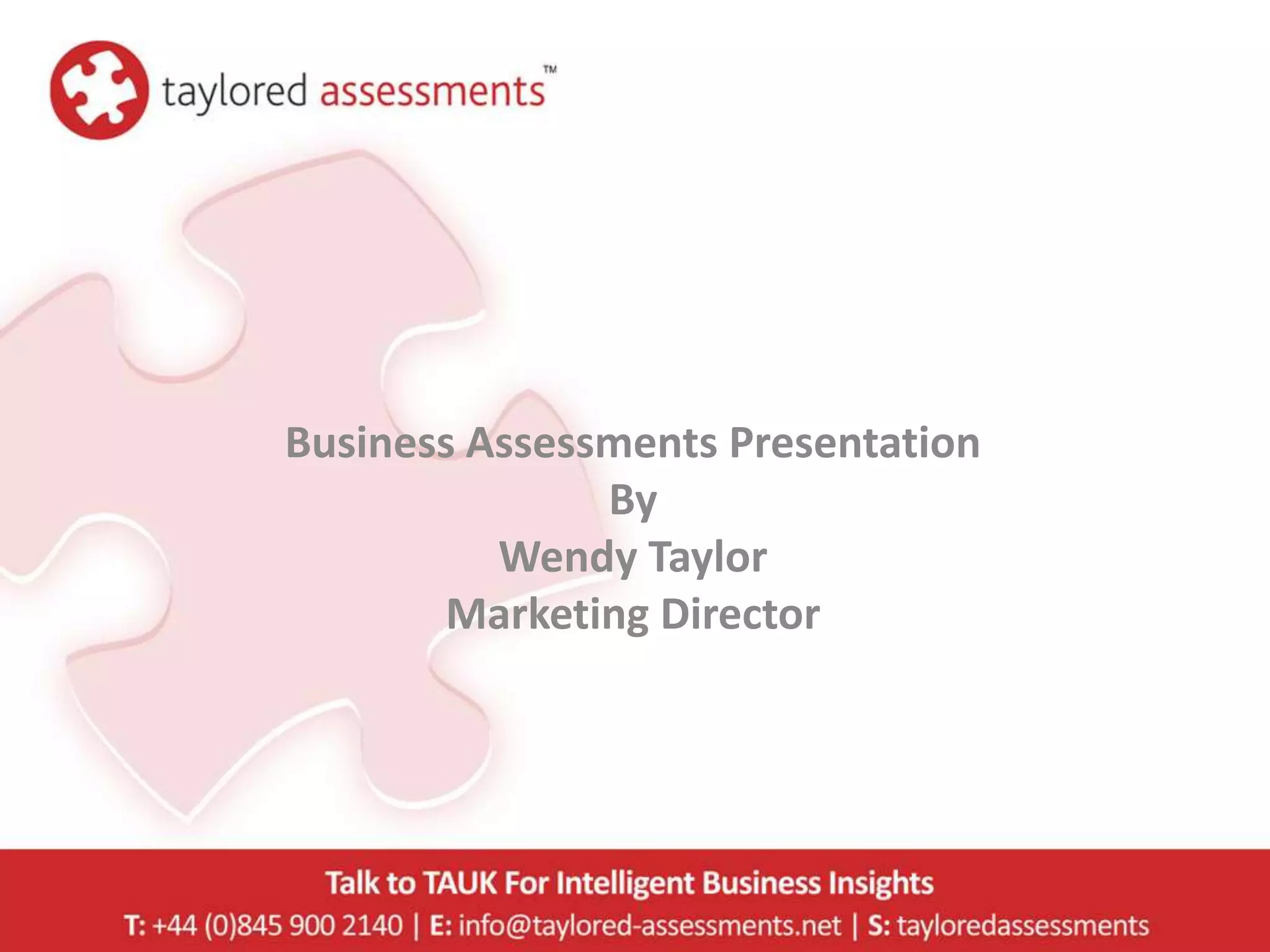 The document summarizes a business assessment tool that identifies performance gaps. The tool is an online survey with questions about business practices rated on importance and current performance. Upon completion, it generates a personalized report showing where to focus future development. The report highlights "hot spots" or main performance gaps to improve business success through better people management and development. The assessment is designed to help any organization serious about empowering people through fact-based knowledge.
