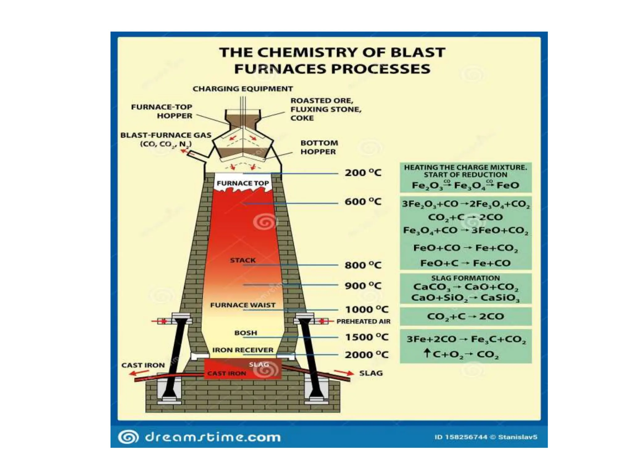 The document describes the processes of isolating elements from ores, highlighting minerals, ores, and gangue, as well as the methods for metal extraction such as concentration, calcination, roasting, and electrolysis. It explains the principles of metallurgy, the significance of leaching, and the use of thermodynamic principles for selecting reducing agents. Additionally, the document covers specific extraction methods for iron, copper, and zinc, detailing the chemical reactions and the formation of various metal oxides and the resultant products.