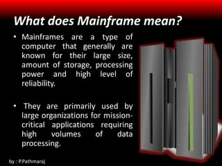 Mainframes first appeared in the 1940s and were large, powerful computers used by organizations for critical applications. They had reliability, capacity for high volumes of data, and ability to host multiple operating systems. In the 1950s and 1960s, mainframes like UNIVAC and IBM 360 drove commercial use and timesharing. Minicomputers like DEC's PDP series beginning in 1960 were smaller and cheaper alternatives. The IBM 360 was the first mainframe to support advanced functions and widespread business/government use through the 1960s.