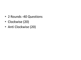 1. The document contains details about a general quiz with 2 rounds and 40 questions total. It provides questions on various topics and asks the participant to identify terms or choose the correct answer from multiple choice safety slides.