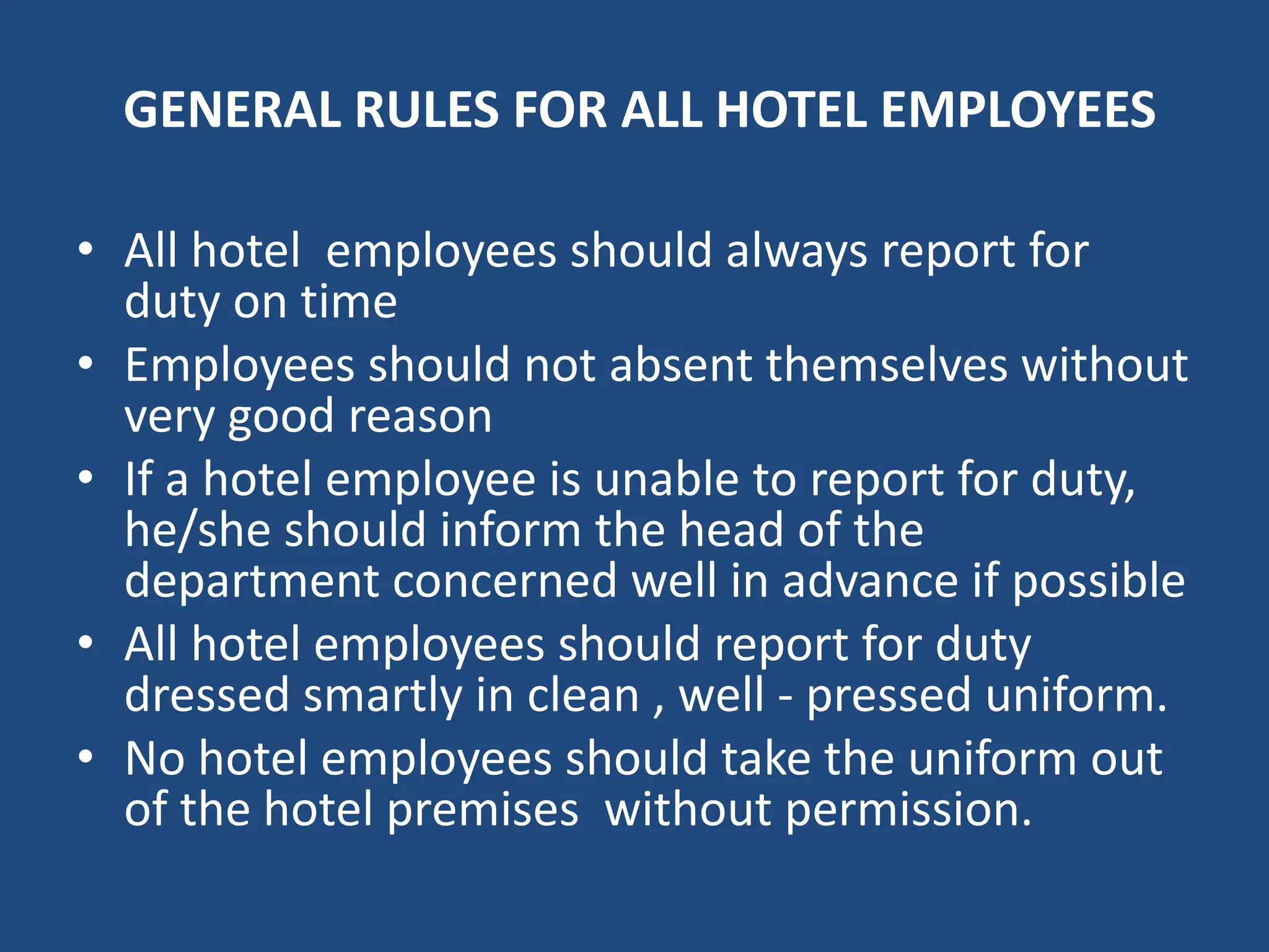 The document outlines general rules for all hotel employees, including: arriving to work on time and informing management in advance of any absences; dressing professionally in clean uniforms that should not be worn off premises without permission; avoiding personal calls and visits to guest rooms during work hours unless given approval; and being honest, loyal, and helping maintain a positive image of the hotel.
