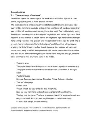 The document describes a game to teach children the days of the week. The children stand in a circle with their arms outstretched and hands stacked on top of their neighbors' hands. One child starts by saying a day of the week and tapping their neighbor's hand. The neighbor then says the next day and taps the next person. This continues until Sunday. On Sunday, the child tries to tap their neighbor's hand without saying the day as a challenge, and whoever's hand is tapped or avoids being tapped sits in the middle and misses a turn. The teaching aims are for children to correctly pronounce and know the order of the days of the week.