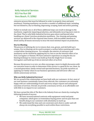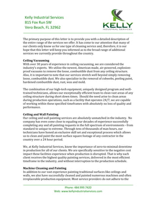 Kelly Industrial Services is an industrial cleaning and painting company that offers ceiling vacuuming, ceiling and wall painting, machine cleaning and painting, and dry ice blasting. They emphasize their over 30 years of experience and expertise in industrial services. They aim to minimize downtime for clients and provide high quality services at affordable costs.