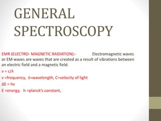 The document provides an overview of electromagnetic radiation (EMR) and its various regions, including radio waves, microwaves, infrared, visible light, ultraviolet, and X-rays. It describes the instruments used in spectroscopy, including various light sources and detectors, as well as the materials for cell construction. Additionally, it outlines Beer’s Law and Lambert’s Law regarding light absorption in relation to the concentration of solutes and the path length.