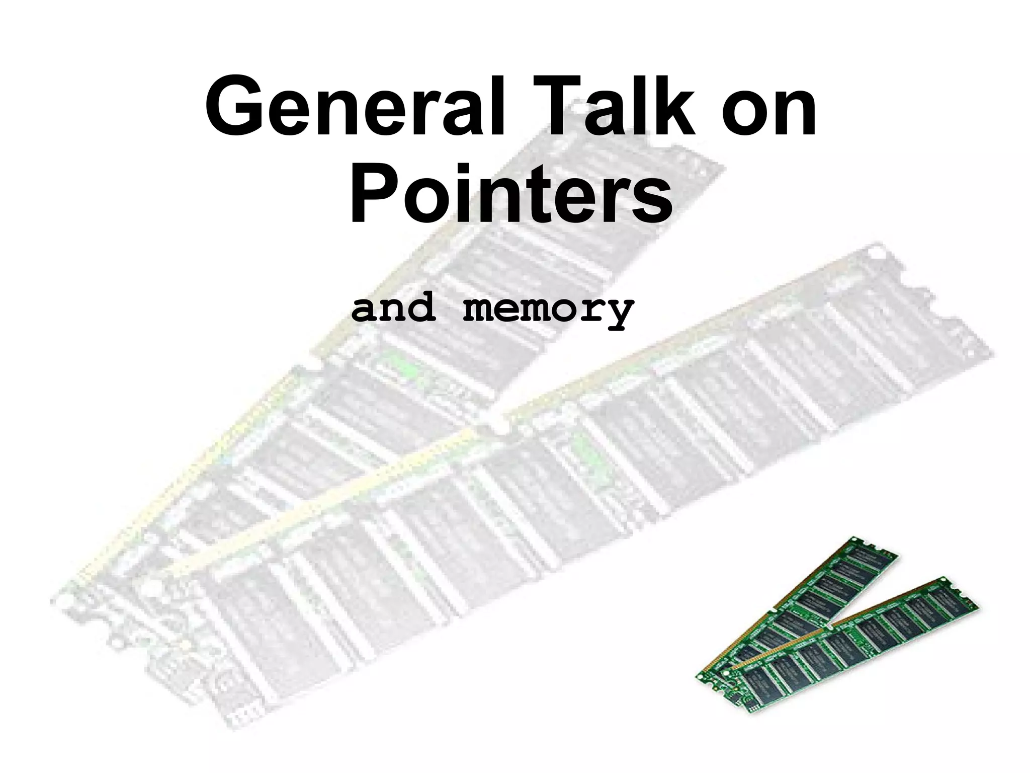 This document discusses pointers and memory in C/C++. It explains that memory is made up of numbered bytes that can be referenced using addresses. Variables have addresses in memory and pointers are variables that store these addresses rather than storing the data directly. The dereference operator * is used to access the data at the address a pointer refers to. The sizeof operator returns the size in bytes of fundamental data types and pointers.