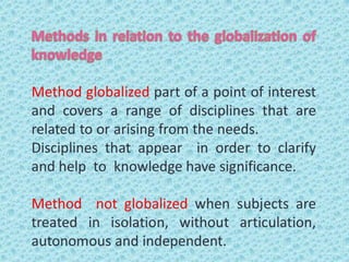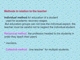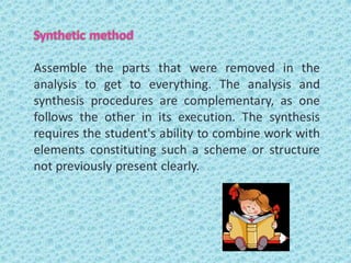 This document defines teaching methods and provides examples of different logical and learning methods. It discusses that teaching methods are the set of coordinated moments and techniques used to guide students toward goals/objectives, and includes presenting the subject, developing the subject, and verifying/correcting learning. Logical methods allow acquiring or producing knowledge, such as induction, deduction, analysis, and synthesis. Induction goes from particular to general, deduction from general to particular, and analysis divides things into parts while synthesis studies parts to understand the whole. Teaching methods can be individual, collective, or mixed based on what is taught. Teaching techniques represent ways to achieve educational purposes and consider participant and subject factors. Examples of techniques include expository, discussion