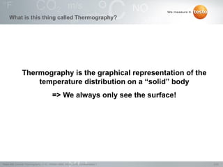 Thermography involves the graphical representation of temperature distribution on surfaces using infrared cameras. It detects electromagnetic radiation emitted from objects based on their temperature, rather than detecting temperature directly. To accurately measure temperature from radiation readings, cameras need information about the object's emissivity and reflected temperature, as real objects do not emit and absorb radiation like ideal blackbodies. Key specifications for infrared cameras include thermal sensitivity, field of view, and instantaneous field of view, which determine the camera's ability to detect small temperature differences and resolve objects at varying distances.
