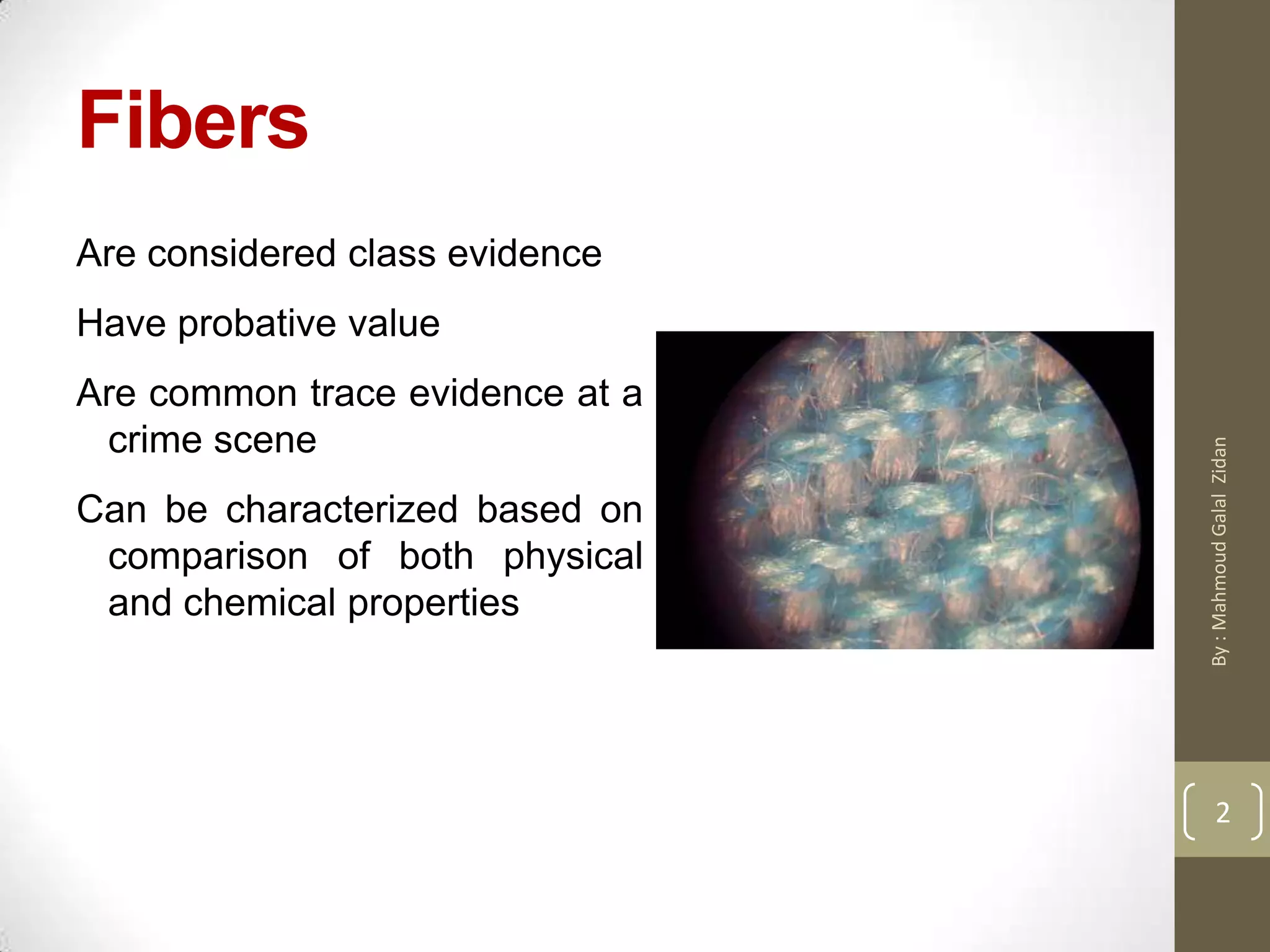 This document discusses different types of fibers, including natural fibers like cotton, silk, and wool, and synthetic fibers like nylon, polyester, and acrylic. It describes how fibers are classified based on their origin as vegetable, animal, or mineral. The document also discusses how fabrics are produced through weaving or knitting, and the different weave patterns like plain, twill, and satin weaves. It provides details on how synthetic fibers are made from polymers and how their properties can be distinguished forensically.