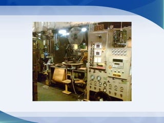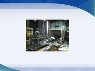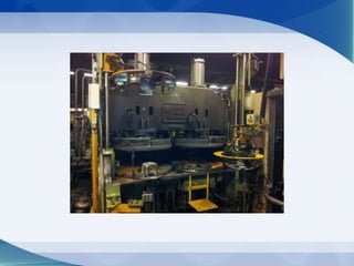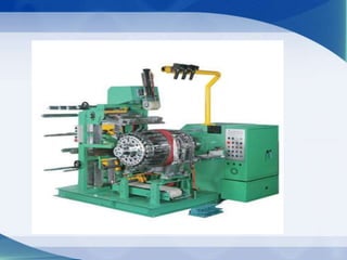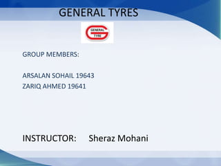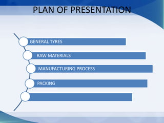 The document discusses the manufacturing process of General Tyres. It describes the raw materials used, which include natural rubber, synthetic rubber, and carbon. The manufacturing process involves several steps: banbury blending mixes the raw materials; milling shapes the rubber sheets; extruding and calendering thin the sheets and make components; components are assembled into green tires; curing forms the tires in a mold; finishing and inspection check quality; and finally, packing wraps the finished tires.
