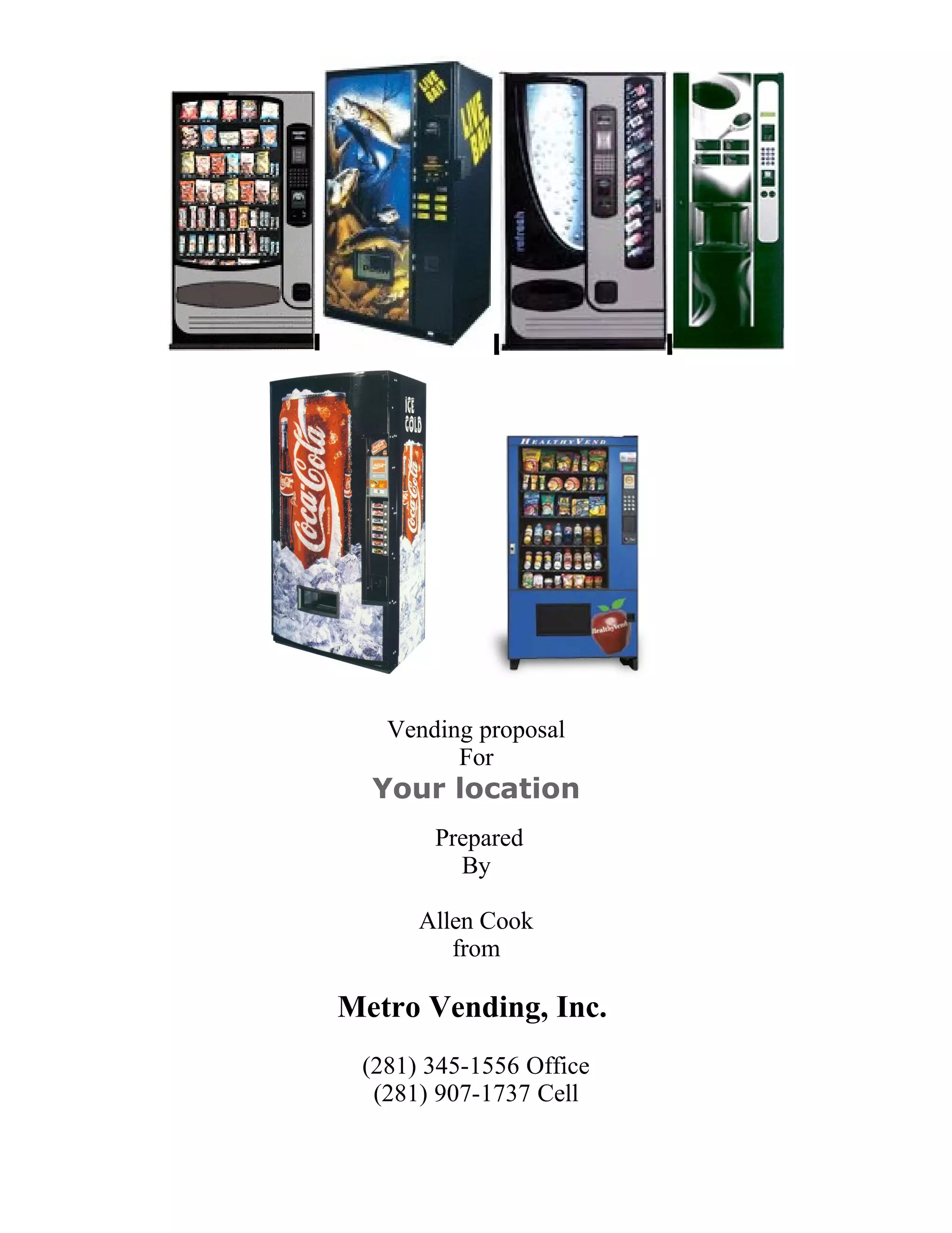 Metro Vending proposes installing vending machines at the location. They offer brand name snack and soda machines that hold 500-800 cans/bottles. Metro provides 24-hour repair service and competitive prices on brand name products. They supply free drinks for holidays and have a single point of contact as the owner-operated business. Metro recommends installing 4 machines and lists pricing and product options.