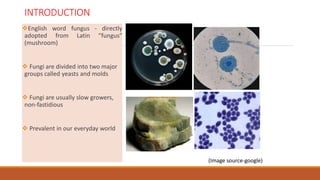 This document discusses the characteristics and classification of fungi, focusing on their division into yeasts and molds. It covers various mycology-related terms, historical advancements in the study of fungi, and the general features of fungal species, including their environments and reproductive methods. Additionally, it describes the different types of mycoses caused by fungi, categorized based on the affected body tissues.