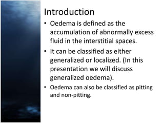 This document discusses the clinical approach to a patient presenting with generalized edema. It defines edema and discusses mechanisms that can cause fluid accumulation. The main causes of generalized edema are cardiac (congestive heart failure), renal (nephrotic syndrome), hepatic (liver cirrhosis), nutritional (malnutrition), allergic reactions, and drugs. Investigations and treatment focus on identifying the underlying cause and using diuretics and fluid restriction to increase excretion of sodium and water. Diuretic classes - thiazides, loops, and potassium-sparing - are described along with their mechanisms, indications, side effects and contraindications. Diuretic resistance and its management are also covered.