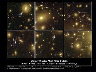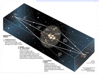 The document discusses how space and time can be warped based on one's frame of reference and motion. It introduces concepts from special and general relativity such as length contraction, time dilation, gravitational time dilation, and how matter warps space-time. It explains how the expansion of space causes galaxies to appear to move away from each other, providing evidence for the Big Bang theory that the universe has expanded over billions of years from a hot, dense state.