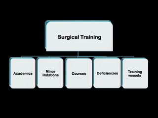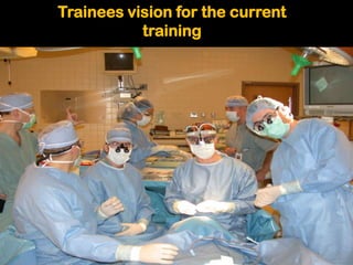 The document outlines a trainees' vision for improving surgical training in Sudan. It identifies several areas of focus, including establishing clear academic objectives and syllabi for each year of residency training. It also recommends minimum numbers of procedures trainees must perform, and levels of supervision. The document proposes short rotations in minor specialties, along with suggested courses and workshops. It acknowledges deficiencies in training, but believes these can be addressed with cooperation between trainers and a large number of diverse cases. Finally, it provides details on surgical training units and hospitals, and outlines a one year plan to allocate trainees across specialties and locations.