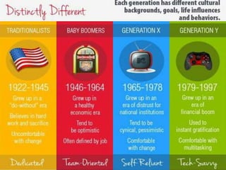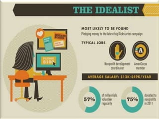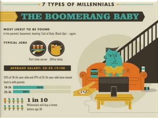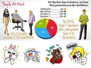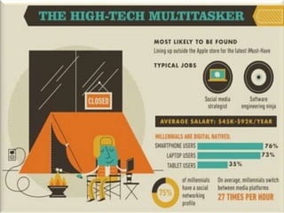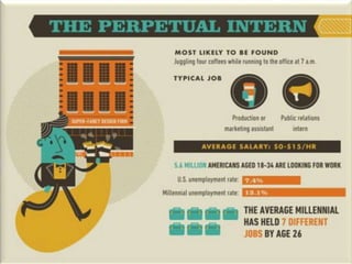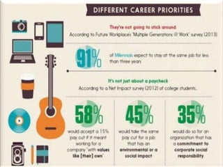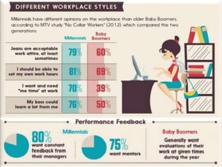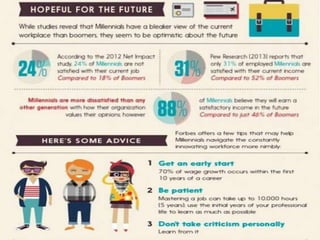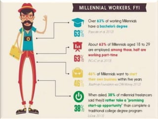 The document discusses characteristics of Millennial workers. Some key points include: - 51% of Millennials prefer communicating with colleagues in person rather than digitally. - Millennials say flexible work hours would increase their productivity. Many also regularly check work emails after hours. - Most Millennials expect to stay in a job for 3-5 years and work for 4 or fewer companies in their career. However, some expect to stay in their current job long-term. - Millennials think the main reason their generation is unprepared for first jobs is a poor work ethic. They believe employers should limit social media usage to increase productivity.
