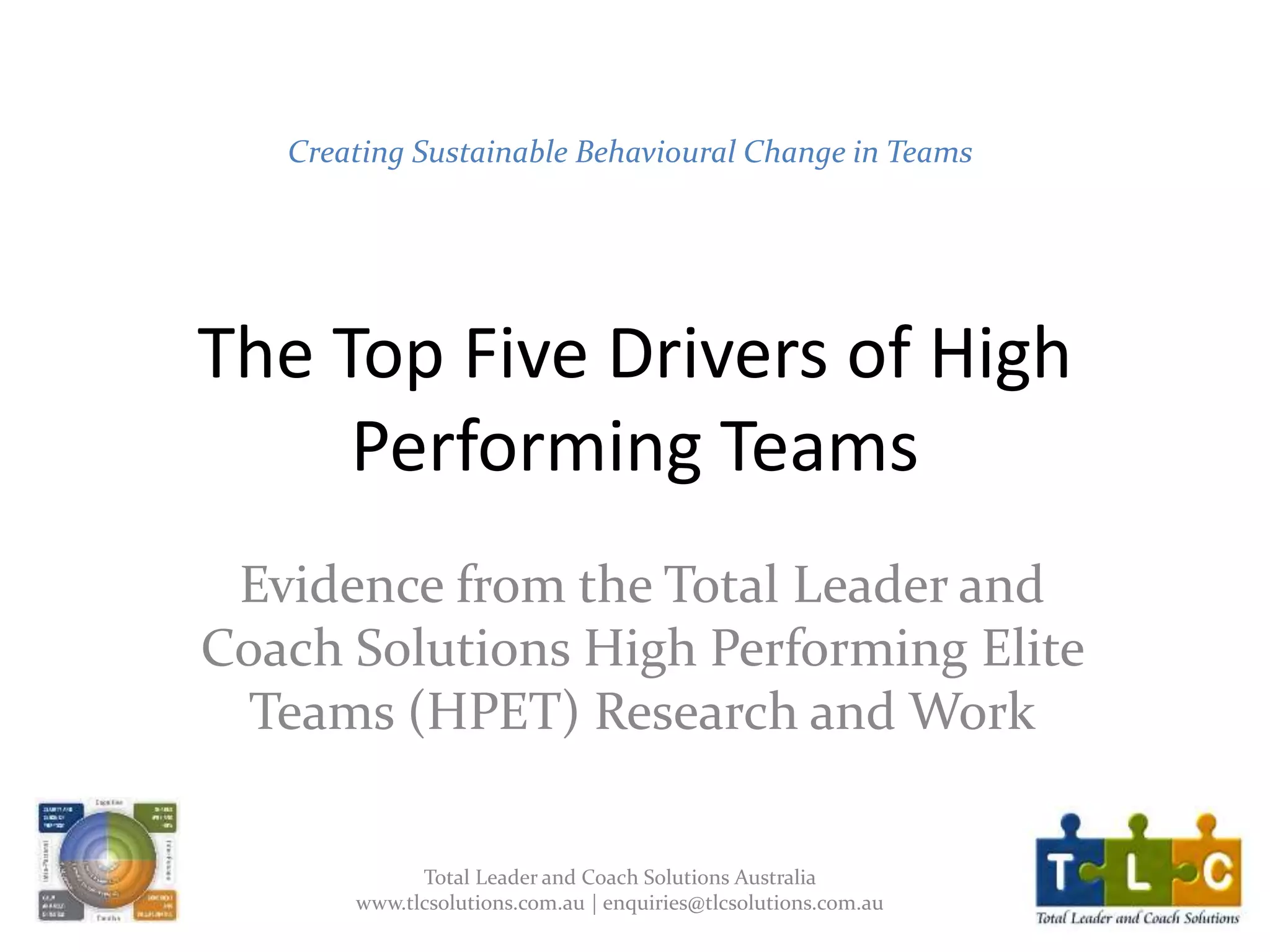 The document outlines the top five drivers for creating high-performing teams based on research from Total Leader and Coach Solutions. Key strategies include fostering a culture of conscious accountability, implementing an agreed way of working, and promoting proactivity while eliminating a victim mentality. It emphasizes the importance of clear roles, effective communication, and constructive conflict resolution as essential levers in team development.