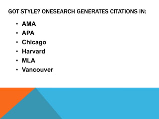 OneSearch can generate citations in AMA, APA, Chicago, Harvard, MLA, and Vancouver styles. To generate a citation, click "Cite" on the item detail page and select the automatically generated citation from the list. However, the citation generator may not always be accurate, so users should check citations against library resources and make any necessary corrections before use.