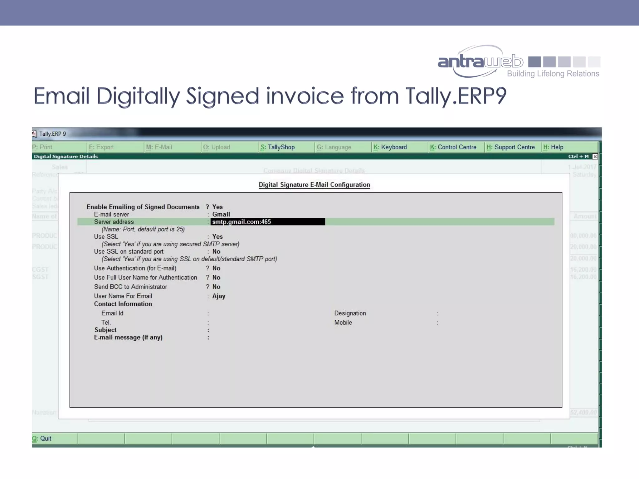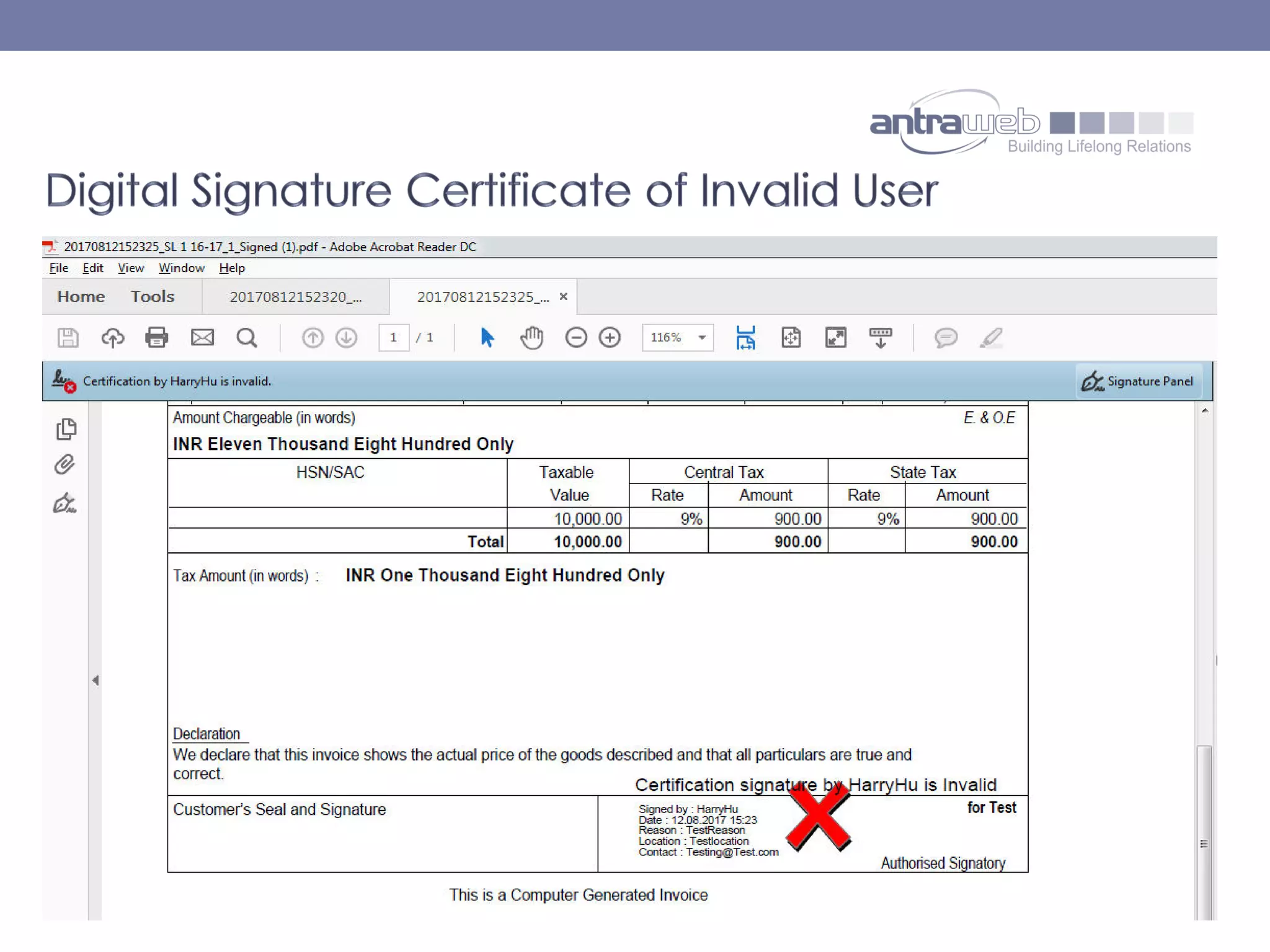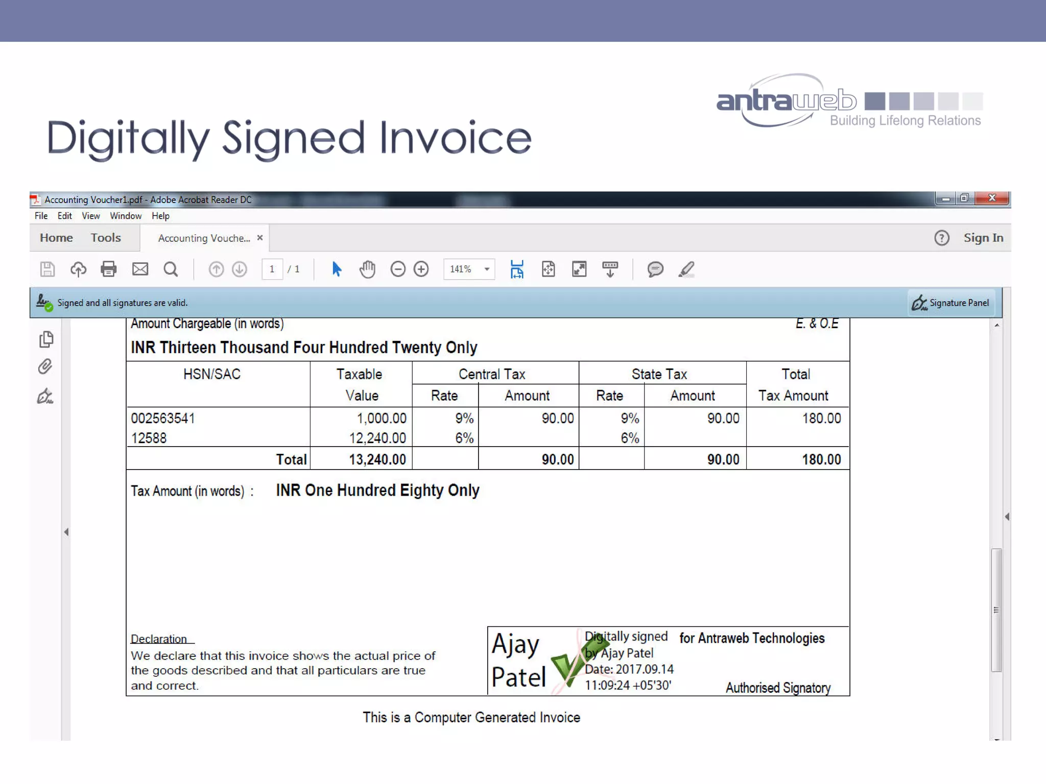 The document describes the functionality of digitally signed invoices in the latest version of Tally.erp 9 by Antraweb Technologies. It explains that a digital signature authenticates documents, outlining how users can generate, email, and manage digitally signed PDFs containing identity information. Users must purchase a digital certificate from a certified authority to enable this feature and ensure the authenticity of invoices created in Tally.erp 9.
