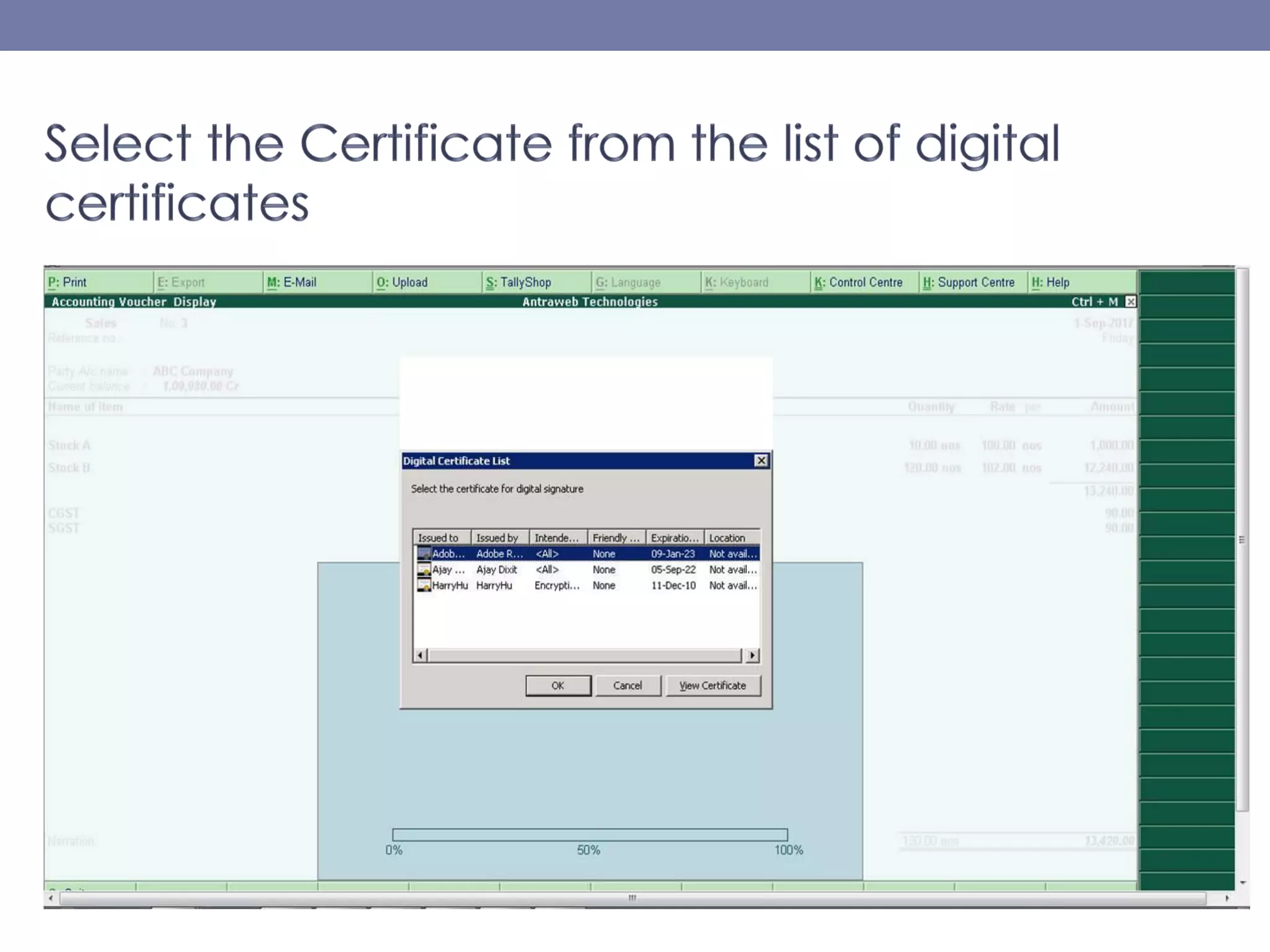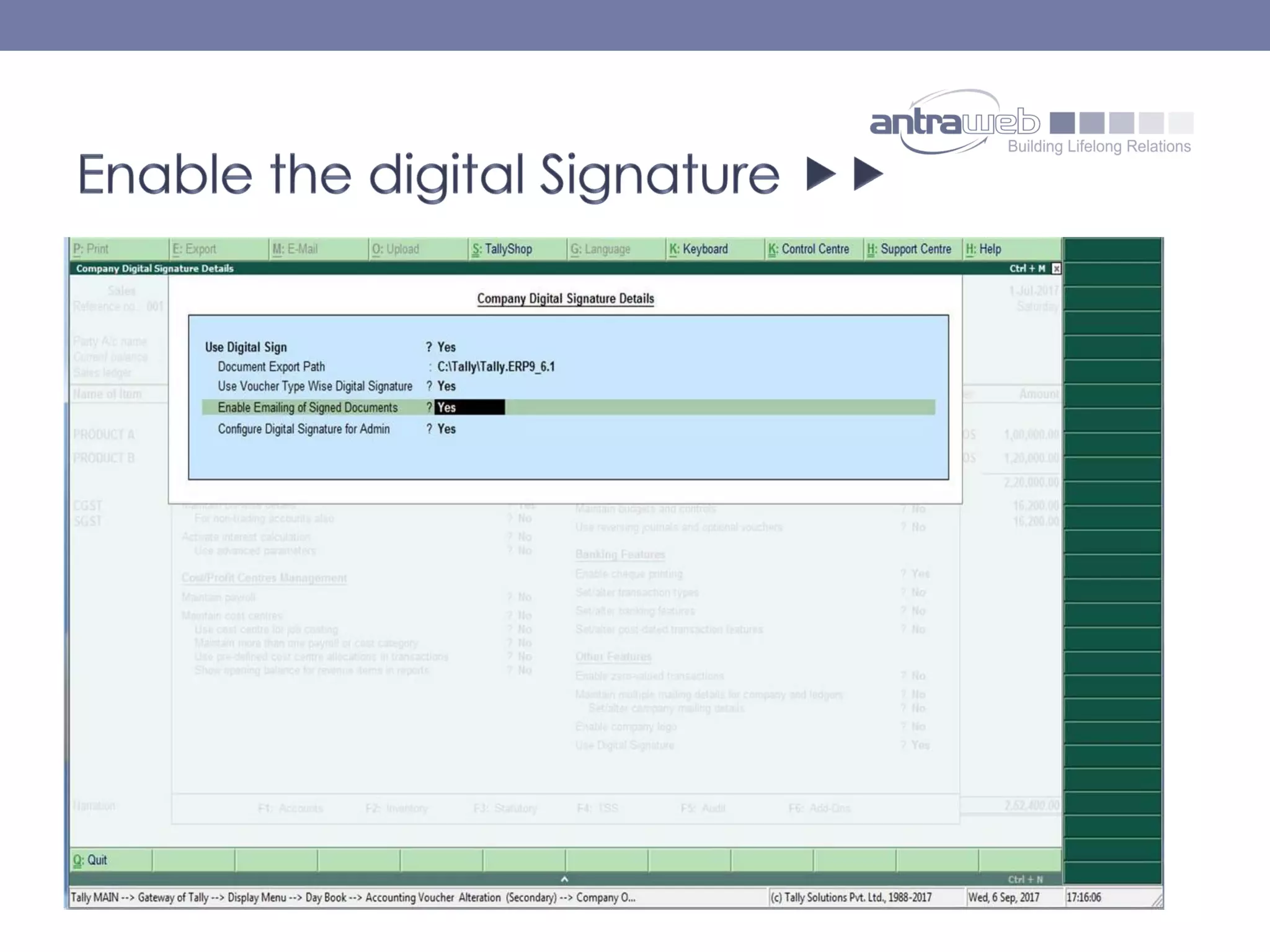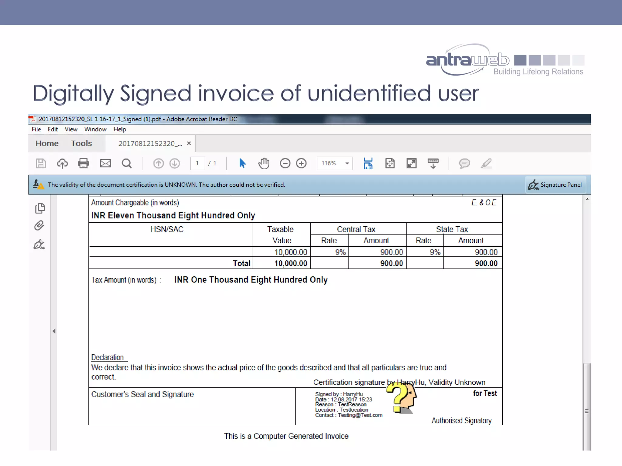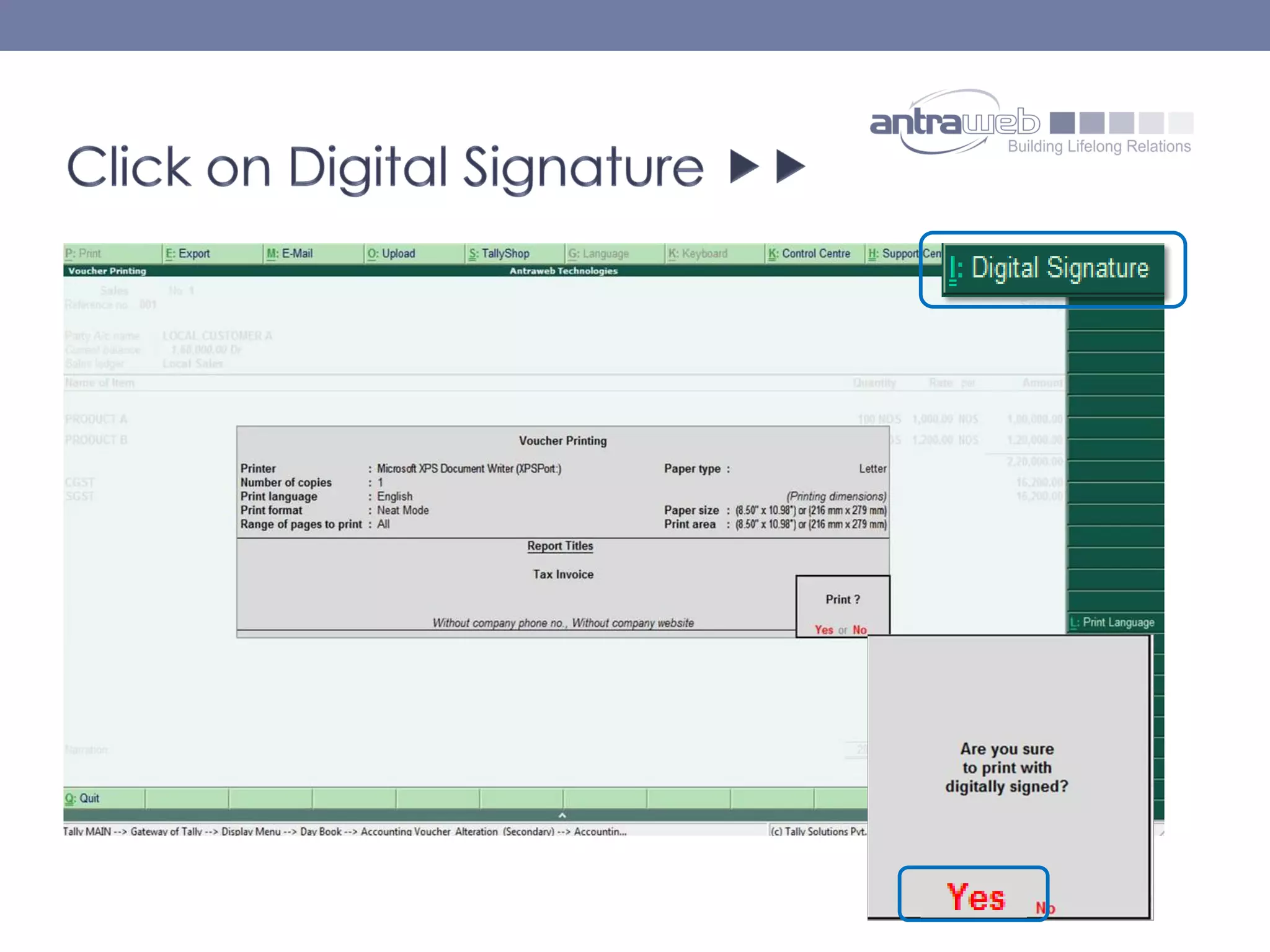 The document describes the functionality of digitally signed invoices in the latest version of Tally.erp 9 by Antraweb Technologies. It explains that a digital signature authenticates documents, outlining how users can generate, email, and manage digitally signed PDFs containing identity information. Users must purchase a digital certificate from a certified authority to enable this feature and ensure the authenticity of invoices created in Tally.erp 9.