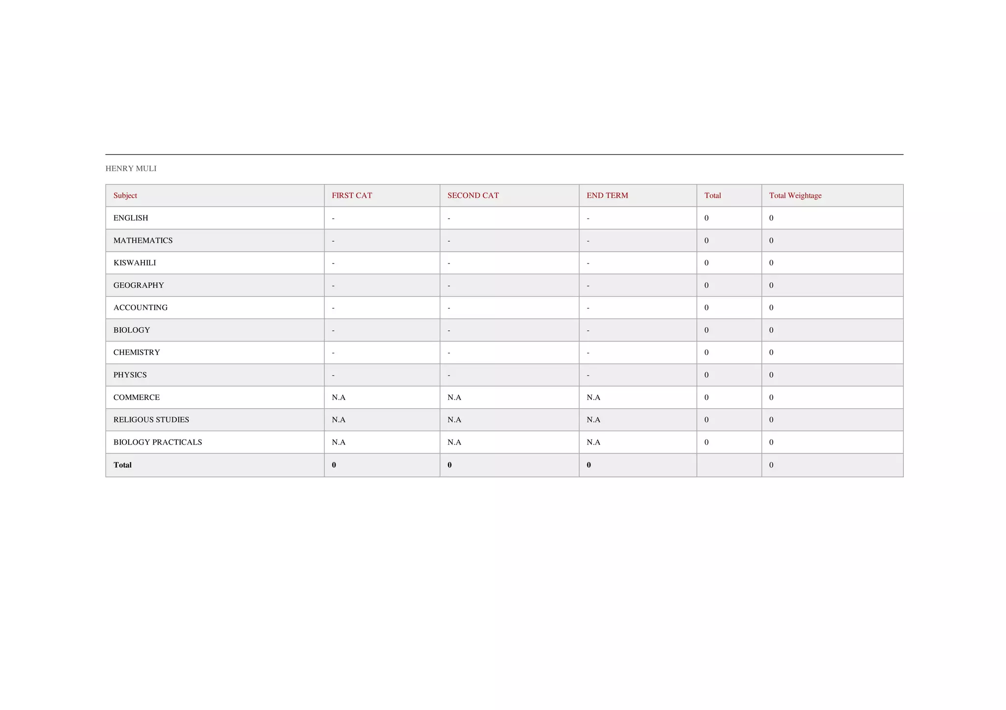 Henry Muli received zero marks in all subjects for the first, second, and end term exams. His total marks and weightage for each subject and overall were zero, indicating he did not pass any of his exams.