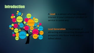 The document discusses lead generation, highlighting its importance in converting interested individuals into potential customers, resulting in increased sales and positive ROI. It presents various techniques for lead generation such as optimizing websites, utilizing social media, and employing digital marketing strategies. Additionally, it introduces a masterclass on generating leads through digital marketing, including course details and a reference link.