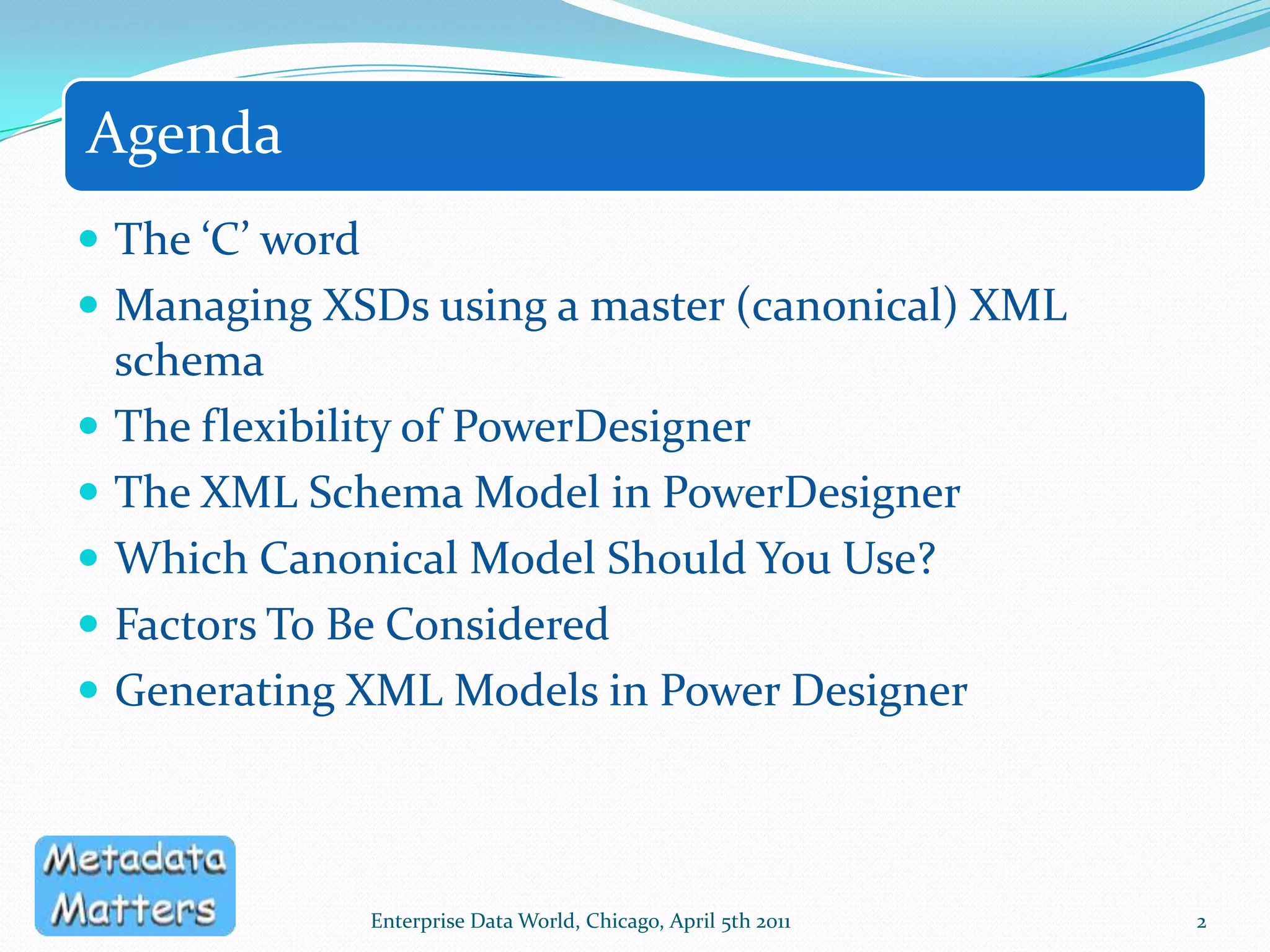 The document discusses the generation of XML schemas from a canonical model, focusing on the use of PowerDesigner for managing XML schemas. It emphasizes the flexibility of PowerDesigner in creating, editing, and maintaining XML schema models, and highlights the need for a hierarchical master schema to ensure consistency. Additionally, it addresses challenges in generating individual schemas and managing multiple reference models effectively.