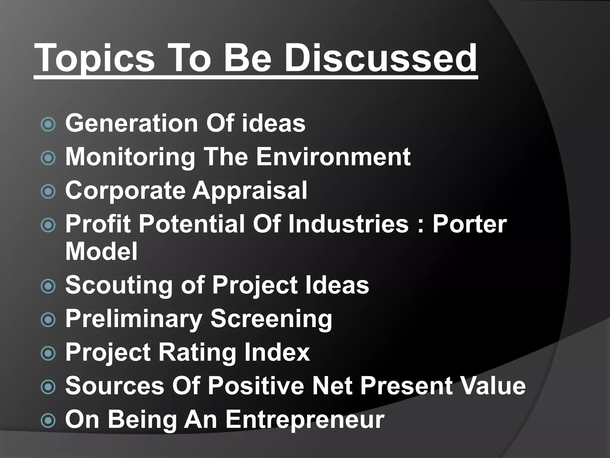 The document outlines key topics for discussion on generating project ideas, corporate appraisal, and assessing the profit potential of industries using Porter's model. It emphasizes the importance of systematic environmental monitoring and conducting SWOT analyses to stimulate creativity and evaluate competitive strengths and weaknesses. Additionally, it explains the influence of market dynamics, including the rivalry among firms and the bargaining power of buyers and suppliers, on industry profitability.