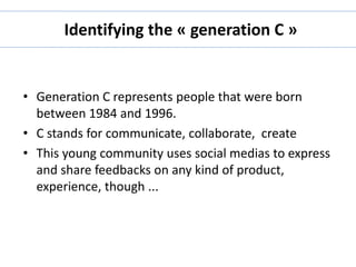 This document discusses Generation C, people born between 1984-1996. Generation C is characterized by their use of social media to communicate, collaborate, and create. The author agrees that social media allows for widespread sharing of ideas and experiences through mobile access to communities. However, the author also disagrees that social media can enable addiction and expose private aspects of ones' life, potentially leading to negative consequences from employers or damage to ones' reputation from inappropriate posts.