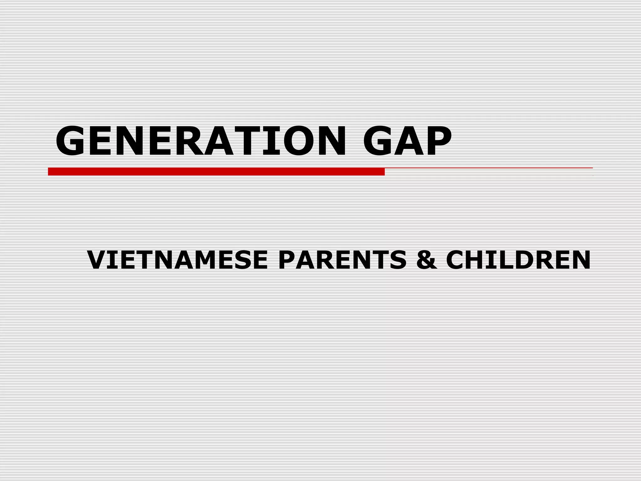 The document discusses the generation gap between Vietnamese parents and children. It identifies factors that contribute to the gap, including differences in education, lifestyle, financial experiences, and family roles. These factors can lead to difficulties in communication, misunderstandings and conflicts between parents and children as they have different perspectives due to their separate life experiences.